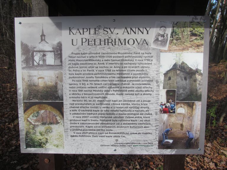 V roce 2007 vzniklo Občanské sdružení Zelené srdce, které se mimo jiné snaží kapli zachránit. Zahájili jsme jednání s Římskokatolickou farností Pelhřimov, která je vlastníkem kaple a městem Pelhřimov, které je vlastníkem okolního pozemku a také zahájili první práce. V roce 2007 jsme odstranili náletové dřeviny z vnitřního prostoru kaple a odvezli veškeré odpadky. V roce 2008 bylo zahájeno vyklízení kaple od suti a zeminy. V roce 2009 bylo dokončeno vyklizení vnitřního prostoru kaple a ve spolupráci s městem Pelhřimov odstraněny z okolí kaple náletové dřeviny a stromy poškozující zdivo. Na svátek sv. Anny 26. července 2009 se v kapli uskutečnil kulturně - duchovní „Den pro kapli sv. Anny,“ jehož se účastnilo cca 100 lidí a podle pamětníků to byla první podobná akce po více jak 50 letech. Od toho roku se akce koná pravidelně. V roce 2010 jsme zahájili projekt „Probuzení kaple sv. Anny“ jehož cílem je probudit zájem lidí o poutní místo kaple sv. Anny a zapojit je do obnovy stavby a místa samotného dobrovolnou pomocí, nebo finančním darem. Ukázat, že je možné spojit síly a obnovit něco krásného pro všechny. Jsme však stále na začátku a obnova kaple, neb alespoň její zakonzervování, bude velice náročná.