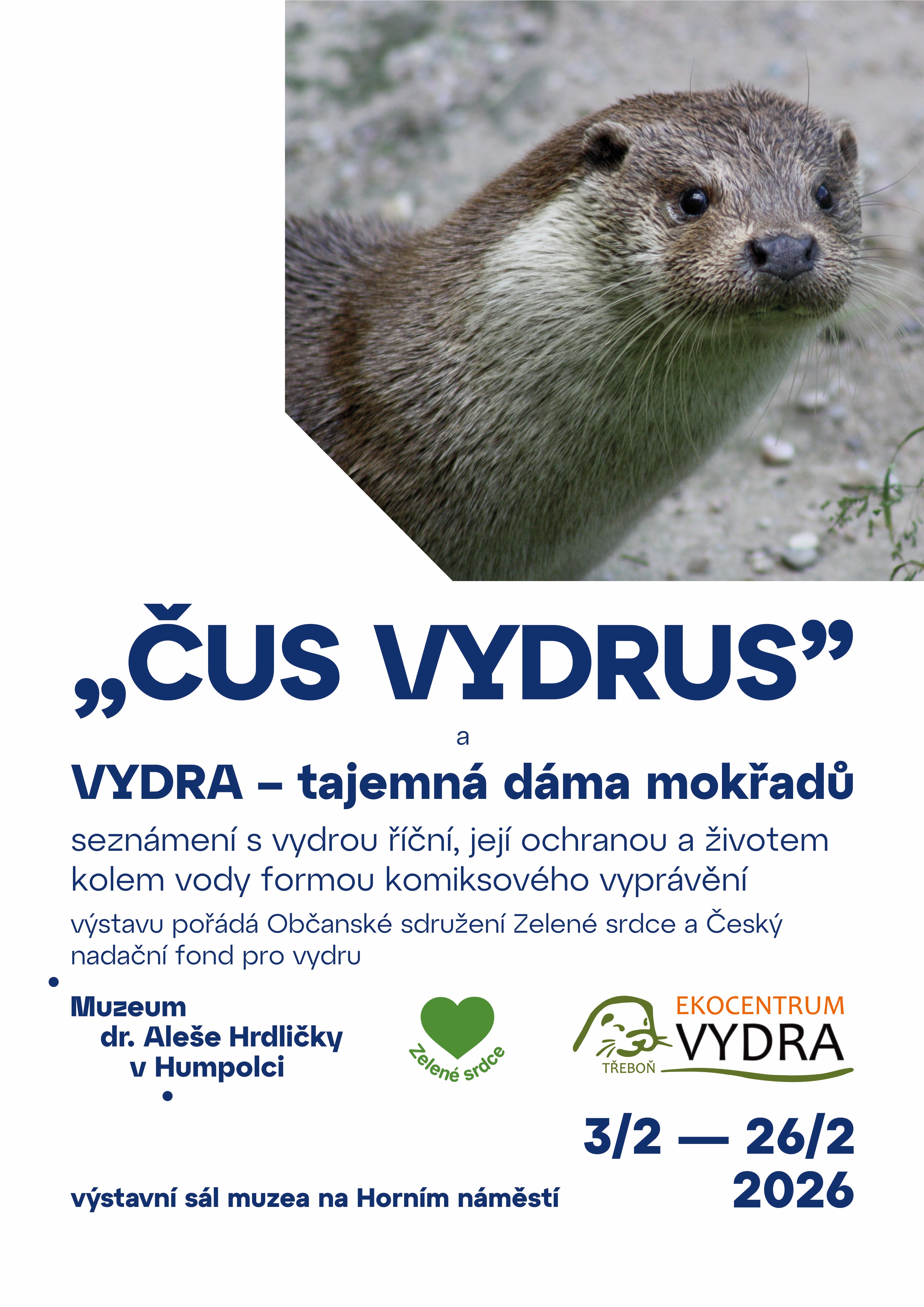 Výstava "ČUS VYDRUS"- kreslený komiks. Hravé seznámení s vydrou říční, její ochranou a životem kolem vody formou komiksového vyprávění. Výstava se uskuteční od 3. do 26. února 2026 v Muzeu dr. A. Hrdličky na Horním náměstí v Humpolci. Pořádáme s Českým nadačním fondem pro vydru.
